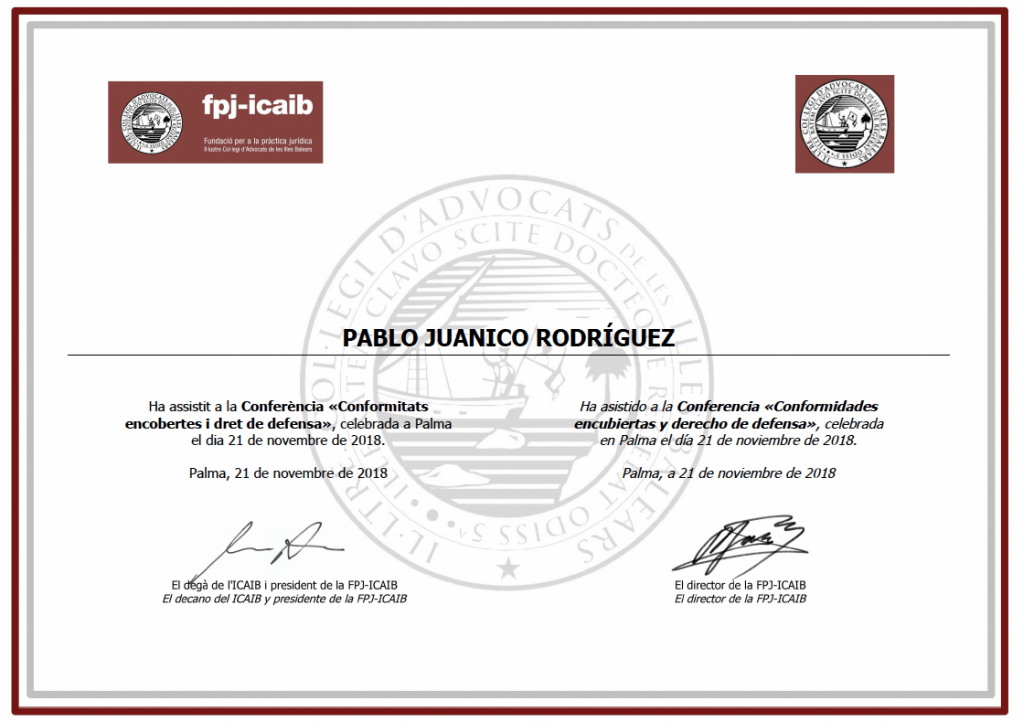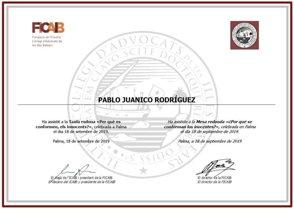 Me gustaría brindar un especial agradecimiento a mis compañeros, a David Vich Comas -socio del Despacho Garrigues Mallorca- y a Francisco López Simó -Decano de la Facultad de Derecho de la UIB-, por el apoyo brindado desde el primer momento.