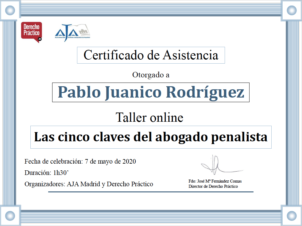 He realizado de forma online el taller formativo ‘Las cinco claves del abogado penalista’, impartido por el abogado Juan Gonzalo Ospina y organizada por AJA Madrid y Derecho Práctico.