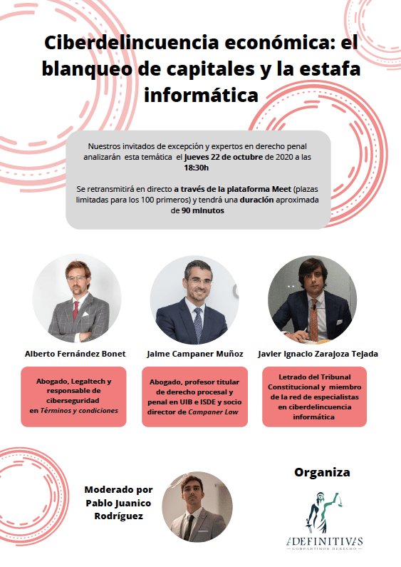 El día 22 de octubre tuve el placer de moderar el evento titulado ‘Ciberdelincuencia económica: el blanqueo de capitales y la estafa electrónica’, organizado por A definitivas.